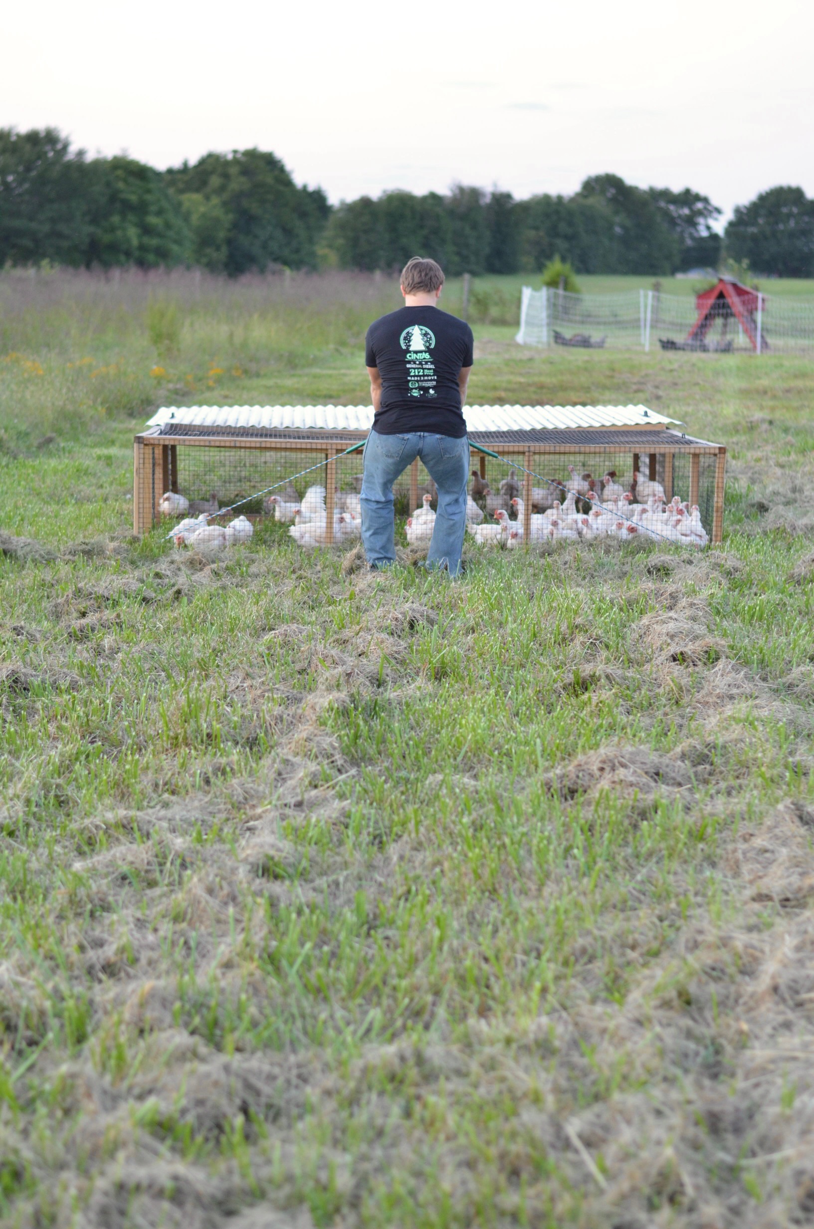 A chicken tractor is a regenerative agriculture tool that enables us to pasture raise our birds in a productive and beneficial way. If we were to give our birds access to all 20 acres at once, they would cherry pick the “candy” grass and leave behind other nutrient packed varieties and weeds. By placing our birds into a moveable, 10x12 structure, we eliminate that problem. This encourages the birds to eat all of the grass and weed varieties within the tractor, and concentrates their manure, which fertilizes the soil. This technique benefits the birds, the land, and, consequently, our health.