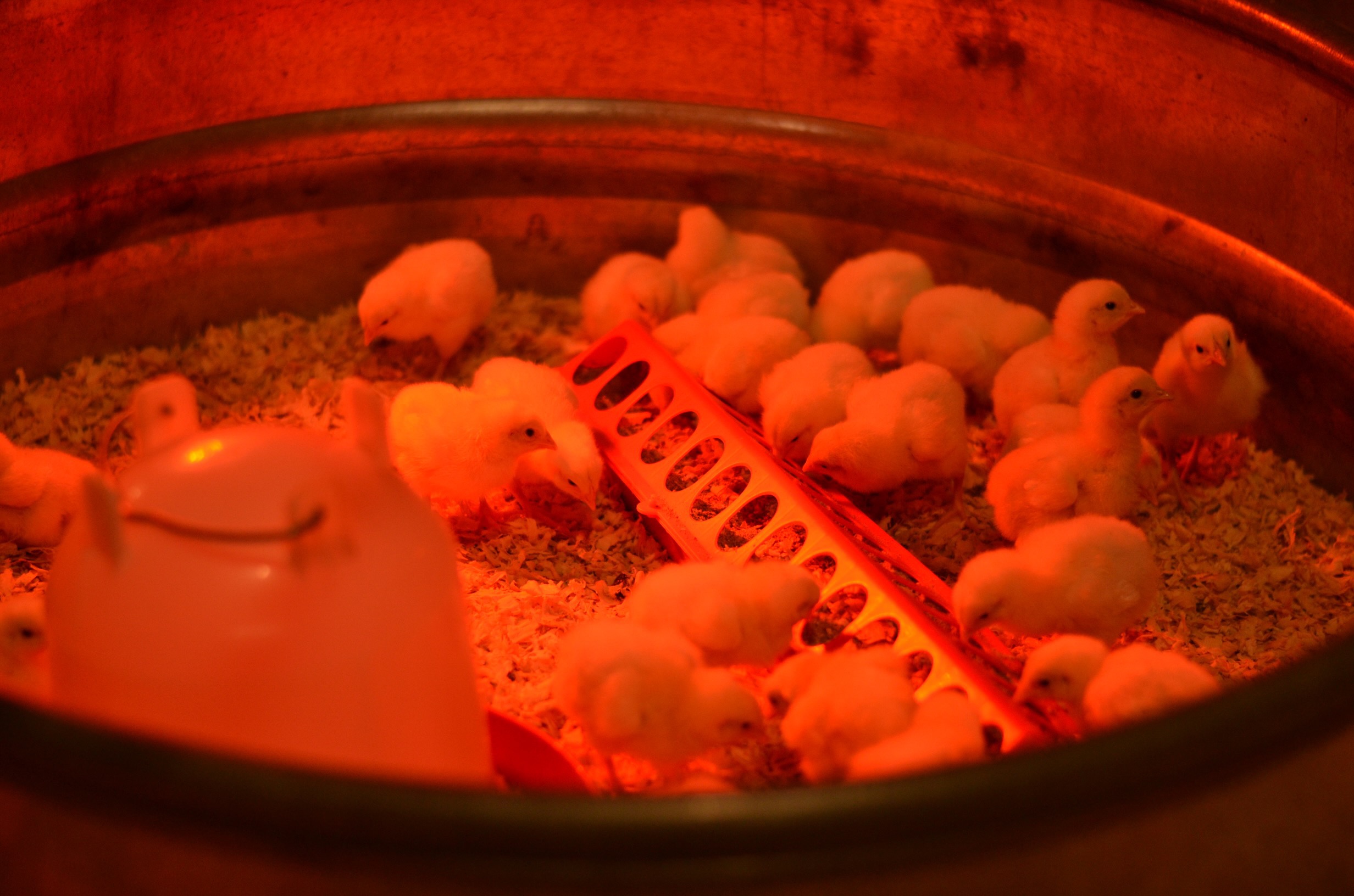 Our chicks remain in the brooder for 14-18 days. We utilize the Deep Bedding Method. We start off the season with 8 inches of fine shavings. Rather than scooping out the "old stuff," we add 1-2 inches of shavings when the brooder becomes moist or smelly. This method increases beneficial bacteria, warmth, and snacks (AKA protein rich bugs). Even our smallest chicks are able to turn over the bedding and aid in the composting process. At the end of the season what is left in the brooder is "gold."